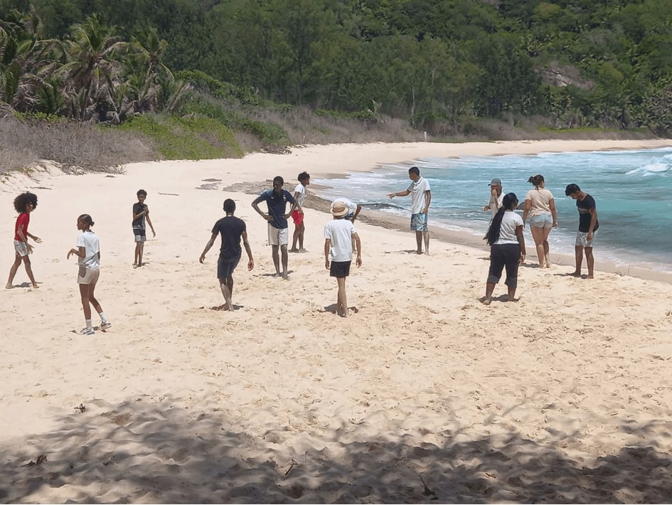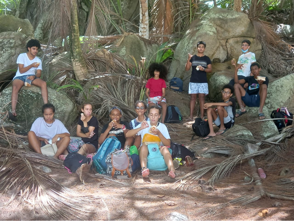 Vers midi, nous avons pris le bus pour nous diriger vers la plage de Grand Police. Le chauffeur nous a déposé un peu plus loin que prévu, donc nous avons dû marcher sur un chemin rocailleux pour y accéder. Une fois arrivés, nous avons marché le long de la plage où des élèves ont aperçu des traces de tortues sur le sable. Nous avons également trouvé 13 nids de tortues, pour certains, les œufs étaient déjà éclos.