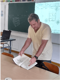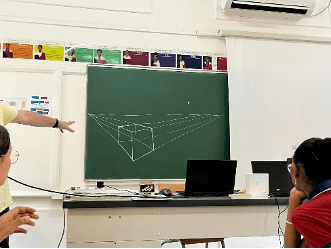 Nous avons vu, par la suite, les différents points de perspective permettant la réalisation d’un croquis comme la perspective à un point de fuite, la perspective à deux points de fuite et celle à trois points de fuite. Après une explication, M. Sugar nous a fait dessiner un Rubix cube à notre façon. Ensuite, il a réalisé trois Rubix cubes selon les différentes perspectives. Il nous a ainsi montré comment représenter un Rubix cube à 2 points de perspective à l’aide d’une ligne horizontale qu’il faut tracer.