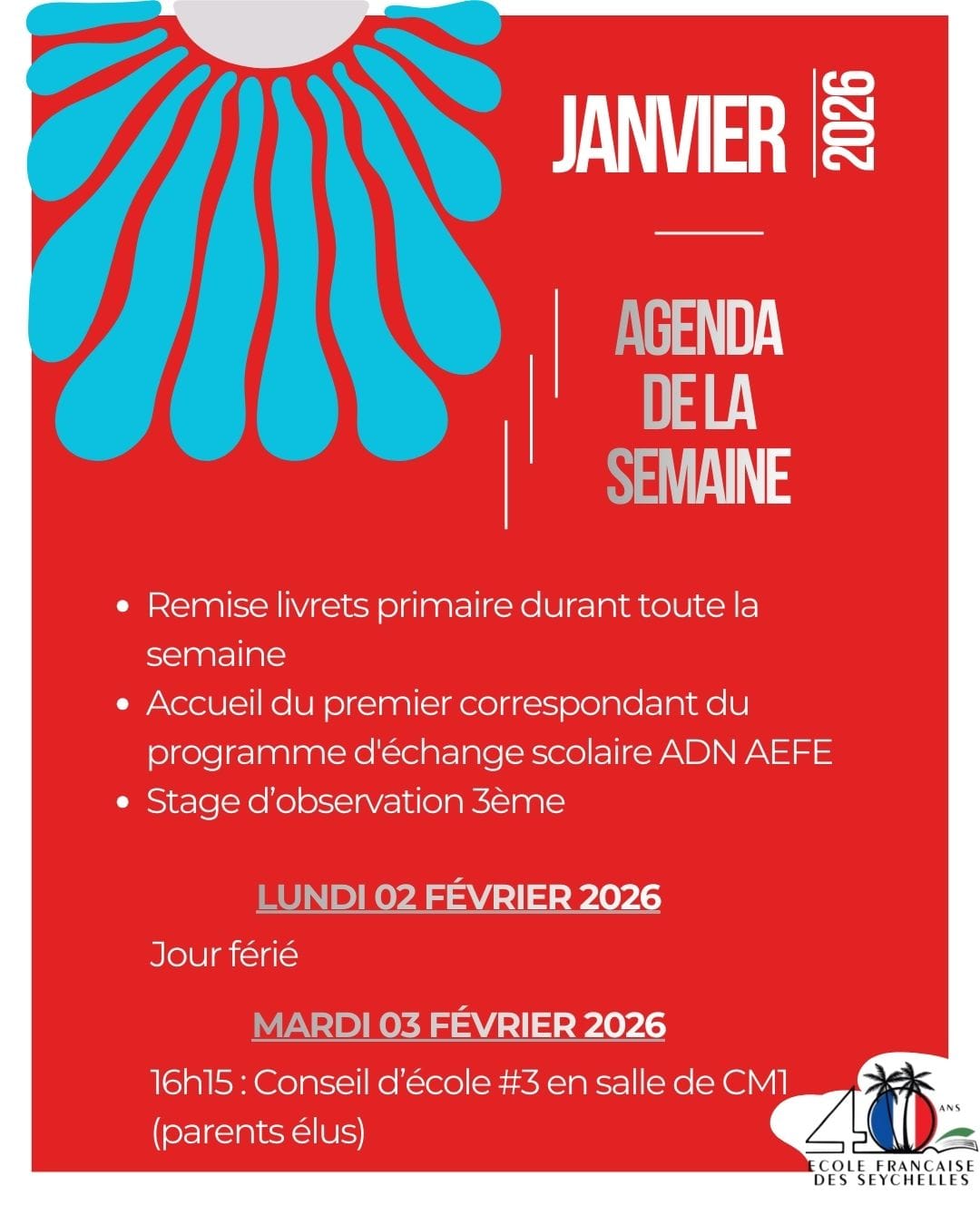 L’École française des Seychelles, en tant que membre du réseau AEFE, s’inscrit pleinement dans la démarche Éco-School aux Seychelles afin de s’engager activement en faveur du développement durable. Notre mantra est : « Éduquer, agir et s’engager pour le développement durable ». Dans cette dynamique, de nombreuses actions ( photos ci-dessous) ont été mises enLire la suite « Eco-school Seychelles : Obtention du label 1 pour le secondaire de l’EFS »