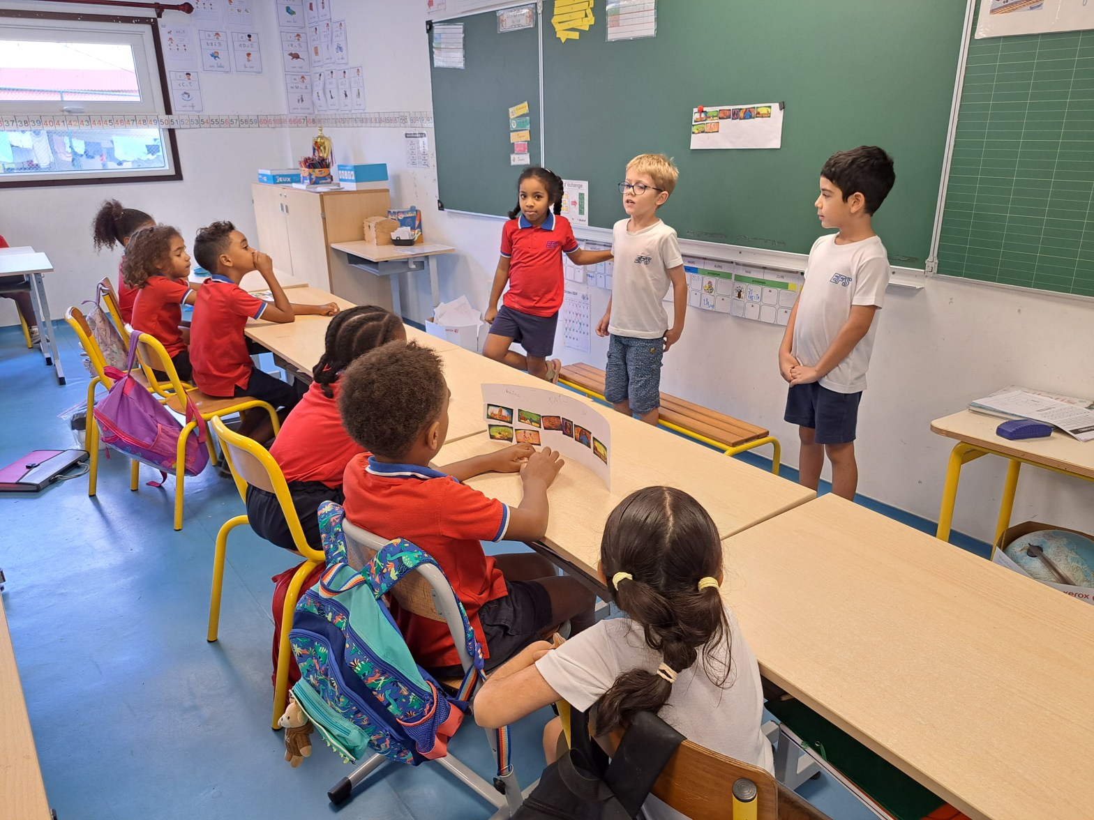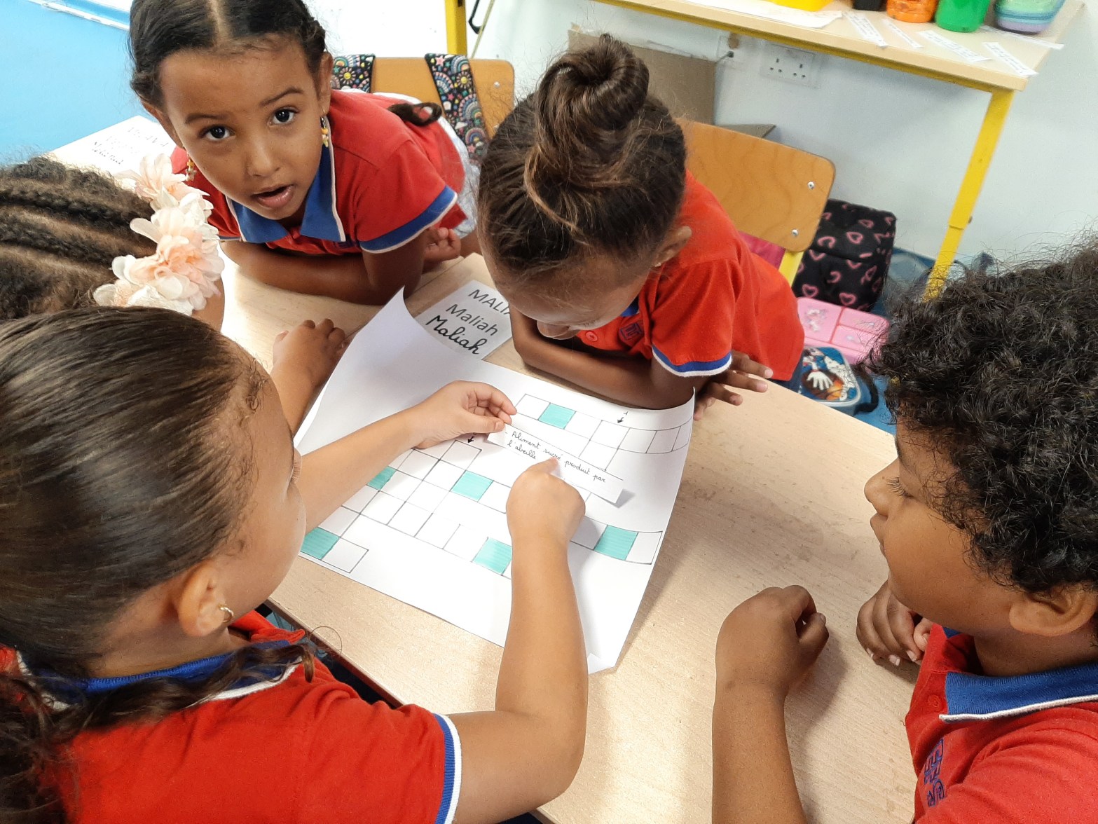 « Dans le cadre de la Semaine des Lycées Français du Monde, les élèves de CE1 et CE2 ontdécouvert quatre mots de la francophonie : butiner, vivant, empreinte, et palmeraie. Après avoirobservé les illustrations de Luc Melanson, ils ont participé avec enthousiasme à un quiz, montrantleur curiosité et leur intérêt pour la richesse de la langue française. »